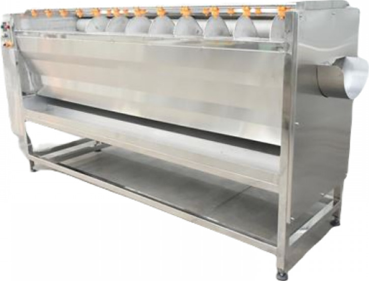 Машина оснащена фильтрующей пластиной для снятия кожуры и винтовым пропеллером для выдачи обработанных корнеплодов.